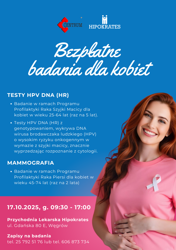 Zapraszamy do zapisów na badania w ramach programów profilaktycznych Raka Szyjki Macicy, testy HPV DAN (HR) praz na badania Mammografii